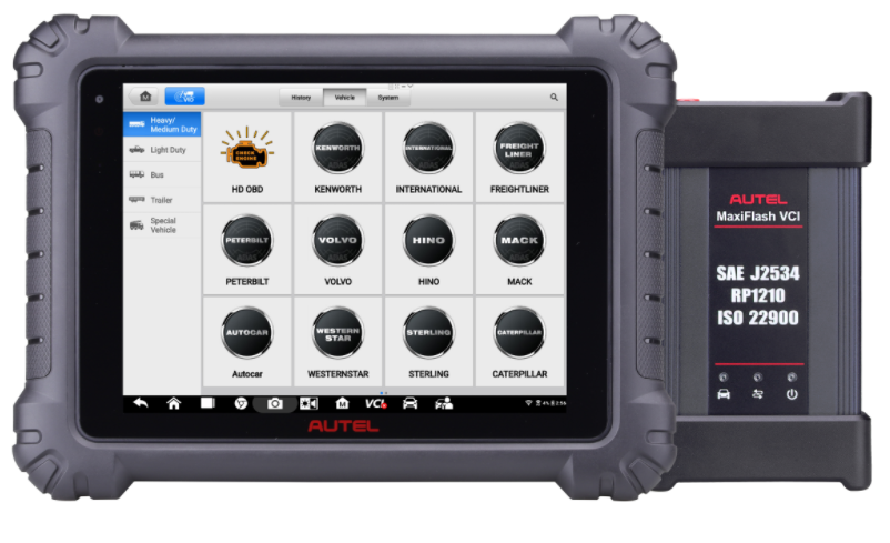 MS909CV is an advanced commercial vehicle diagnostic tablet compatible with 80+ models of light, medium and heavy duty vehicles. The 9.7-inch wireless Android-based touchscreen tablet performs extensive diagnostics including the ability to read/erase codes, view/graph live data, and perform active tests. The tablet includes a Bluetooth-enabled vehicle communication interface (VCI)/J2534 pass-thru programmer, the MaxiBAS B200 battery/starting/charging system test device, alligator clamps, multimeter and amp clamps. The tablet also includes ADAS Calibration Software for Class 3-5 vehicles and Class 6-8 vehicles with dynamically calibrated systems. MS909CV includes one year limited warranty and a year of free software updates.