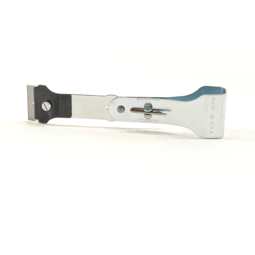 Easy and safe to use and store. This scraper is a great tool to remove residue and adhesives from glass. Also can be used to remove urethane when prepping a pinchweld. Handle can hinge in the center to be pivoted into 35 degree locking positions. Safe and secure bolt through blade holder. Best of all, when finished, just fold the scraper in half and the blade is protected by the handle of the tool! Made of hardened steel and comes with 5 razor blades.