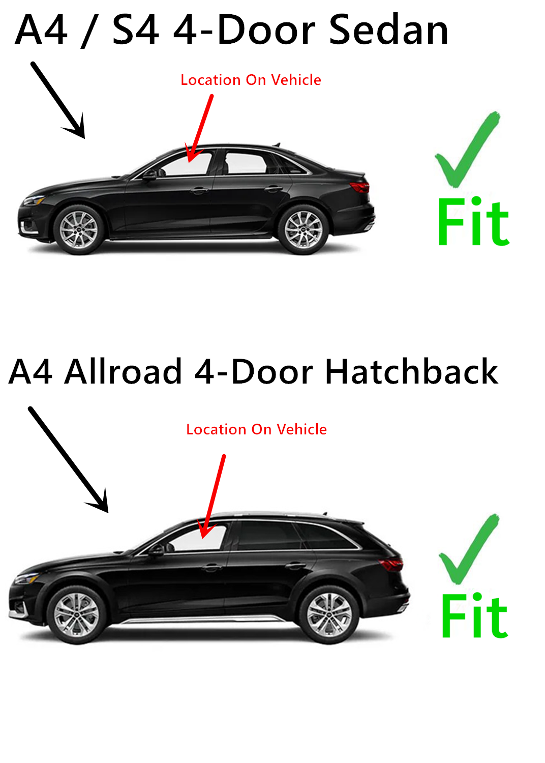 Driver Left Side Front Door Window Door Glass Compatible with Audi A4 / S4 / A4 Allroad 2017-2022 Models Compatible Models: 2017-2022 A4 4 Door Sedan , 2017-2022 A4 Allroad 4 Door Station Wagon , 2017-2022 S4 4 Door Sedan Glass Detail : Tempered Glass , Solar Controlled Glass Location...