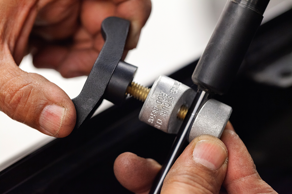 - Open the hood or rear hatch, attach the device to the metal rod on the gas cylinder, and secure.
