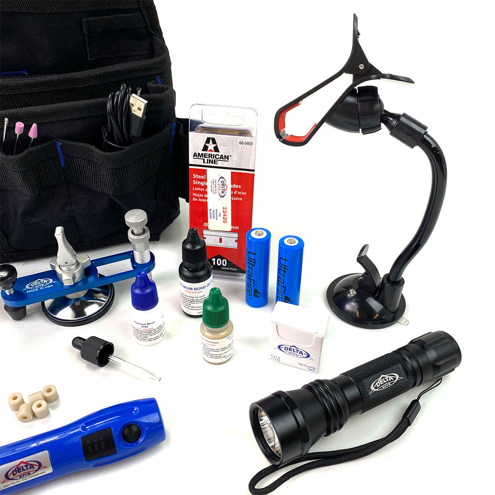 The 36800 EZ-200S Mini Mobile windshield repair system offers big value in a small package. Featuring the Delta Kits On-The-Go Pro Pack, designed to neatly store all of your essential tools in a compact, durable, and well-organized pouch, that mounts conveniently on your belt so your equipment is always within reach. The EZ-200S Mini Mobile Windshield Repair System also includes the space-saving B150 Bridge assembly and the Ignite LED UV Lamp, plus enough supplies to complete at least 50 repairs. No other windshield repair system offers so much for such a low price!