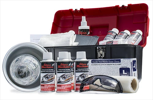GLASS MECHANIX HEADLIGHT RESTORATION PROFESSIONAL KIT (UPS GROUND ONLY) 1 CARRYING CASE 2 ROLLS RAPID MASK 1 WATER SPRAY BOTTLE 100 GLOVES (BOX) 48 SHEETS 600-GRIT WET SAND PAPER 48 ALCOHOL SWABS 48 LINT FREE TOWELS 12 UNITS RAPID CLEAR HEADLIGHT RESTORATION 12 RAZOR BLADES 24 WARRANTY CERTIFICATES 1 UV...